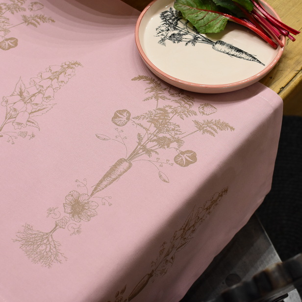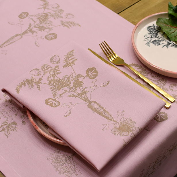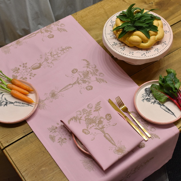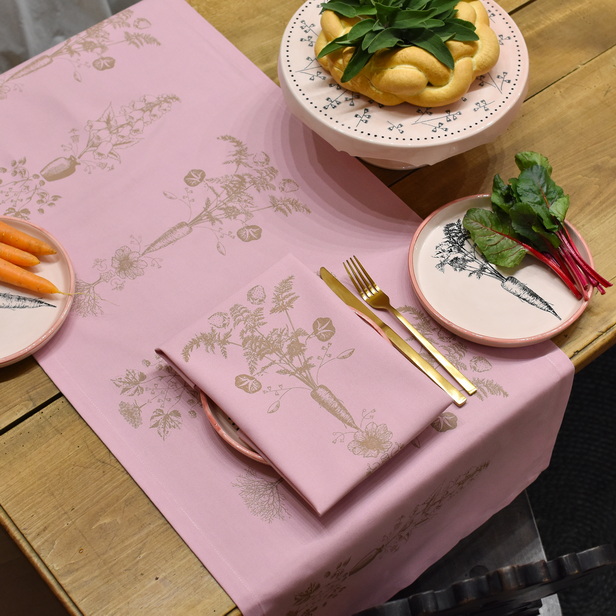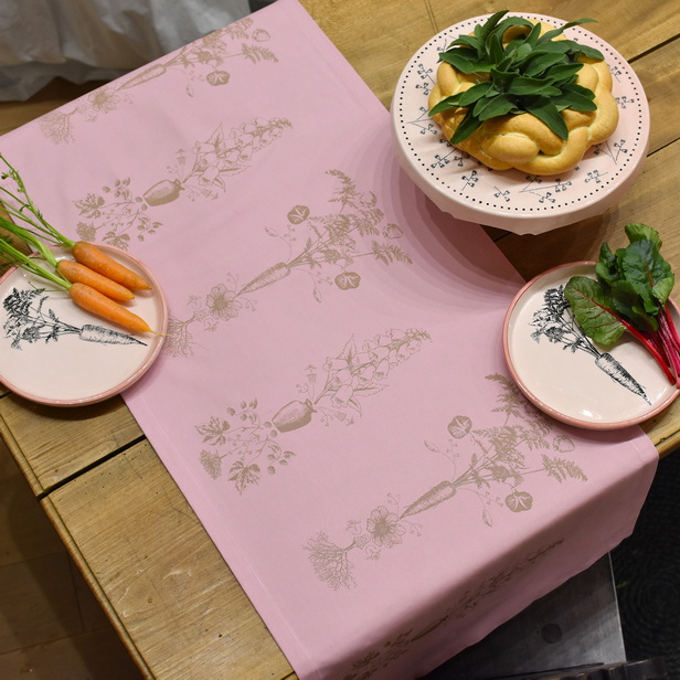 Namizni tekač v roza barvi, potiskan z motivom 4 letni časi v bež barvi.