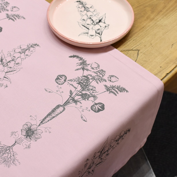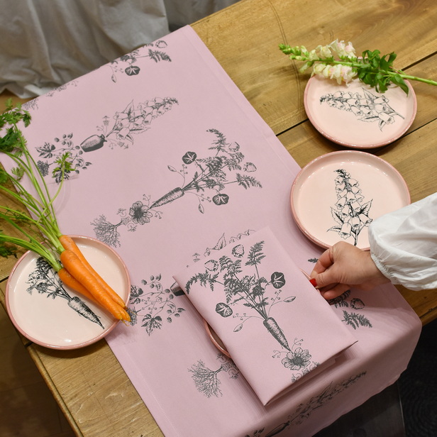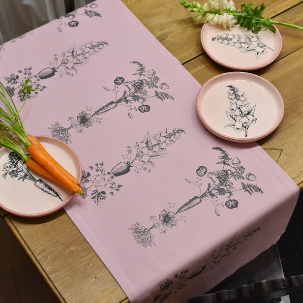 Namizni tekač v roza barvi, potiskan z motivom 4 letnih časov v sivi barvi.