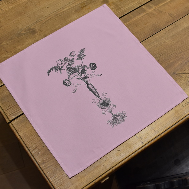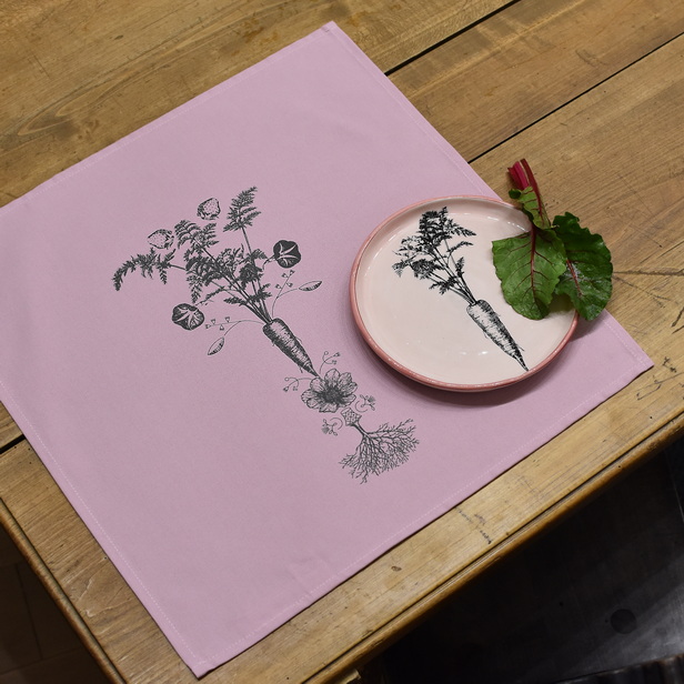 Roza prtiček, ročno potiskan z motivom korenčka v sivi barvi.