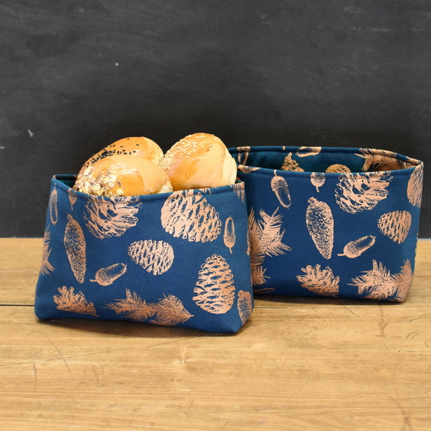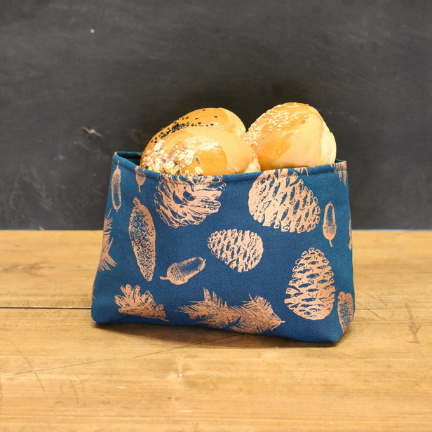 KOŠARICA ZA KRUH. ROČNO TISKANA Z IZBRANIM VZORCEM BAKRENIH STORŽEV IN SMREKOVIH VEJIC. 100% BIO BOMBAŽ PETROLEJ BARVE.