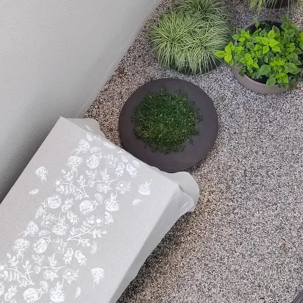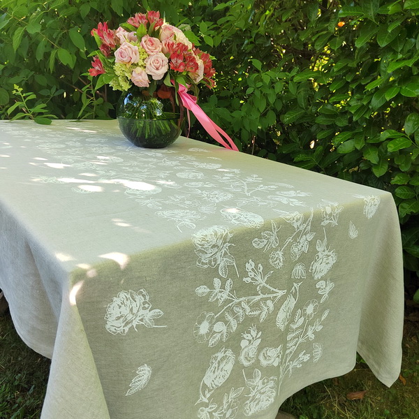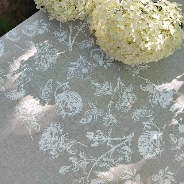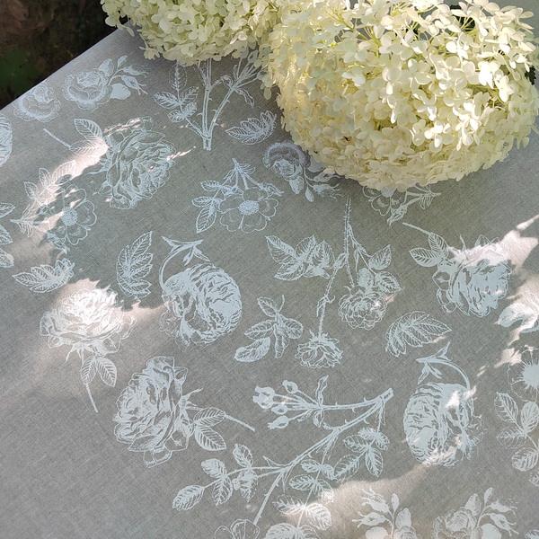 NAMIZNI PRT. ROČNO POTISKAN Z IZBRANIM VZORCEM BELIH VRTNIC. 100% NATUR LAN.