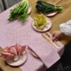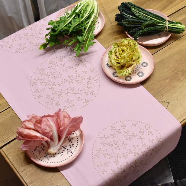 Namizni tekač v roza barvi, potiskan z old rose barvo vezenine.