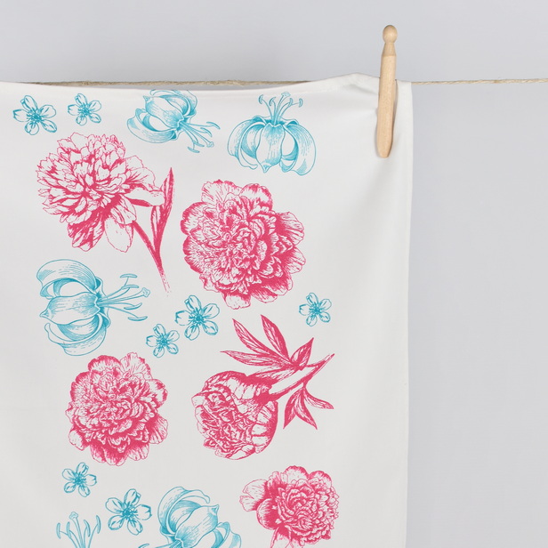Kuhinjska krpa s potiskom potonik, alojzijevih lilij in češnjevih cvetov prinaša razkošje cvetja v vsak dom.