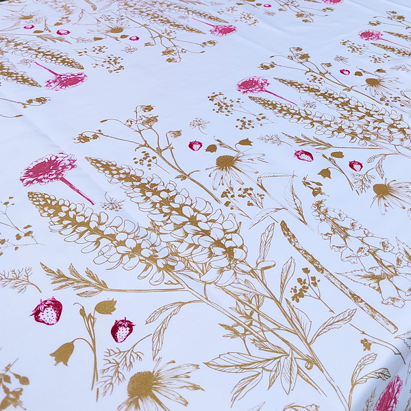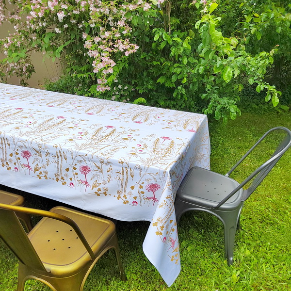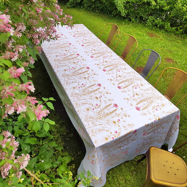 NAMIZNI PRT. ROČNO POTISKAN Z IZBRANIM VZORCEM GARTELJCA. ROŽE SO TISKANE Z ZLATO BARVO IN KOMBINIRANE Z RDEČO IN OLD ROSE BARVO. 100% BELI LAN.