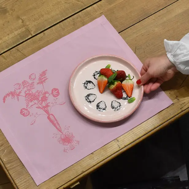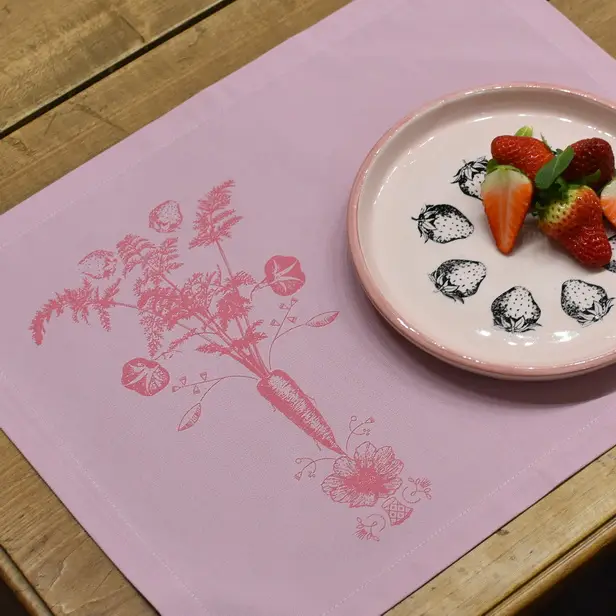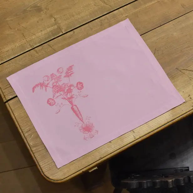 Roza pogrinjek, ročno potiskan z motivom korenčka v old rose barvi.