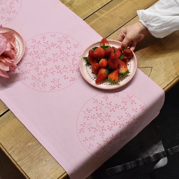 Tekač v roza barvi potiskan z old rose barvo vezenine.