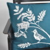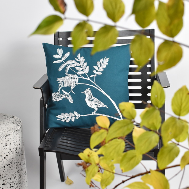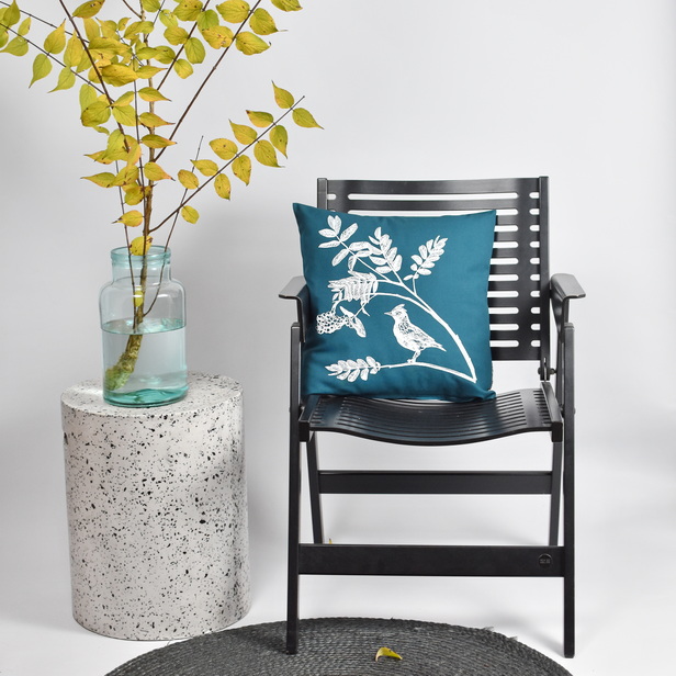 PREVLEKA ZA OKRASNO BLAZINO V PETROLEJ BARVI. 100% BIO BOMBAŽ. ROČNO POTISKANA BELA VEJA JEREBIKE IN BEL ŠKRJANEC.