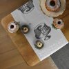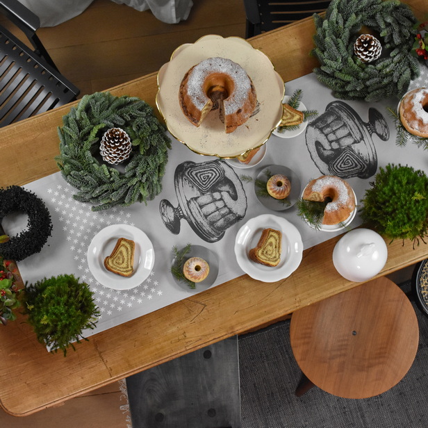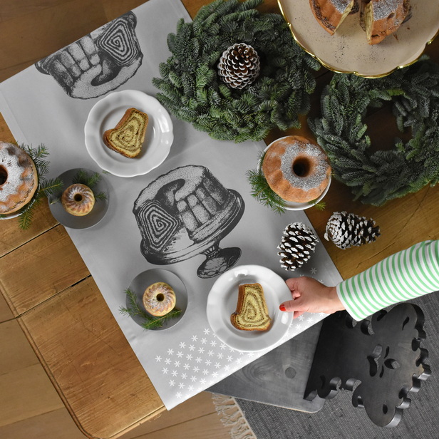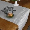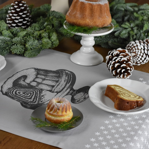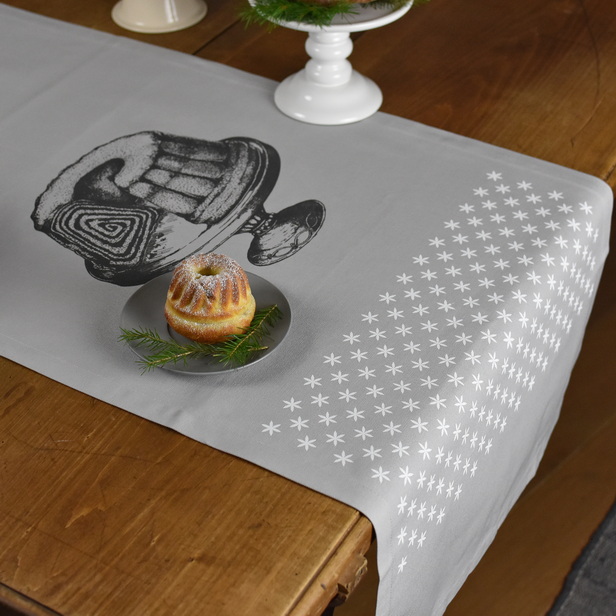 NAMIZNI TEKAČ V SVETLO SIVI BARVI, ROČNO POTISKAN Z IZBRANIM VZORCEM POTICE IN BELIMI ZVEZDICAMI. 100% BIO BOMBAŽ.