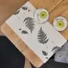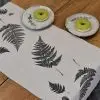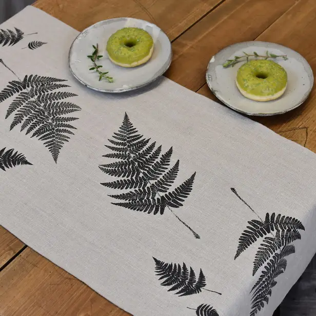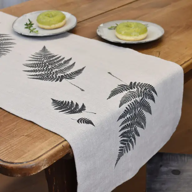 NAMIZNI TEKAČ IZ LANU. ROČNO POTISKAN Z IZBRANIM VZORCEM PRAPROTI V ČRNI BARVI.