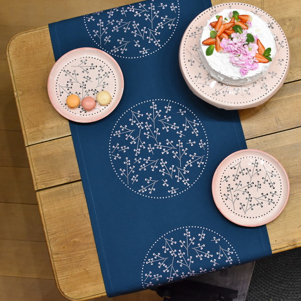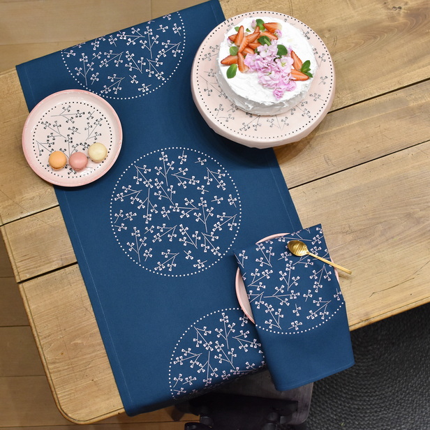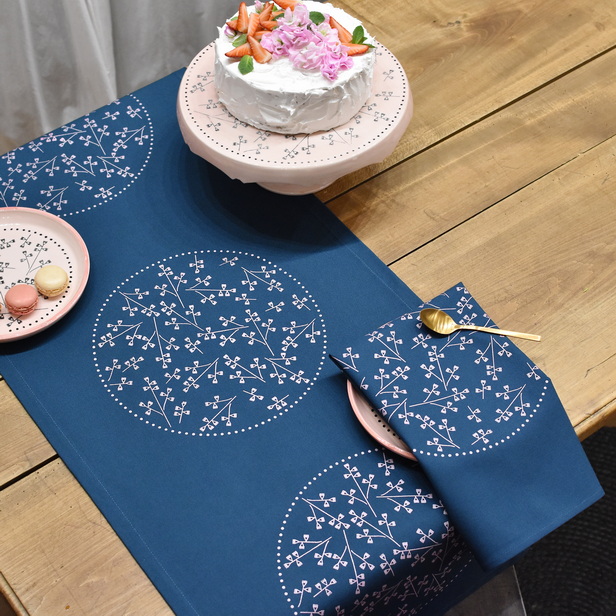 Namizni tekač v petrolej modri barvi, potiskan z roza barvo vezenine.