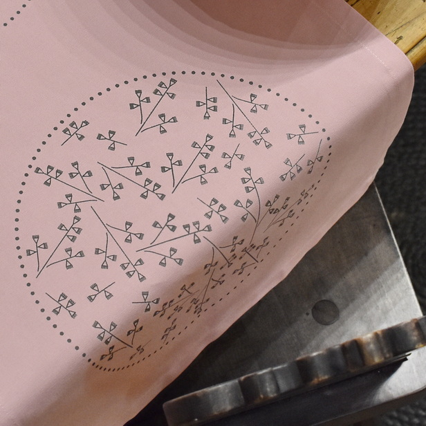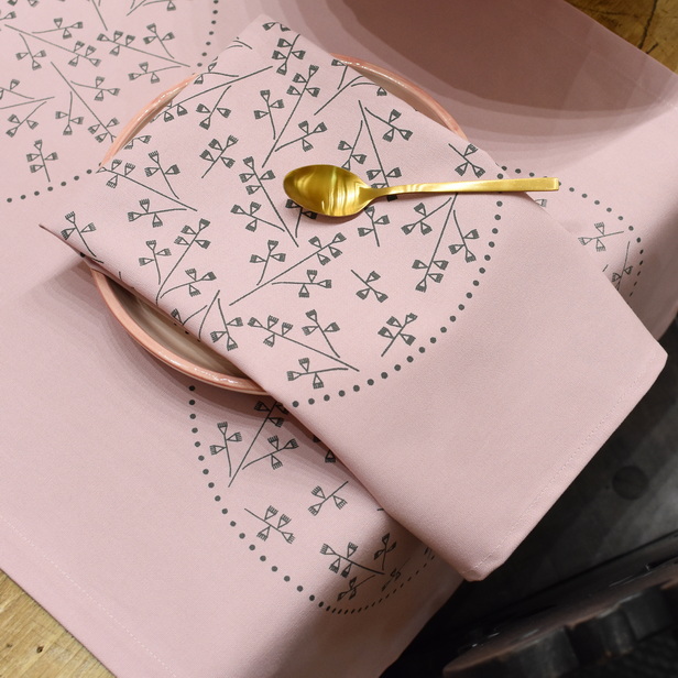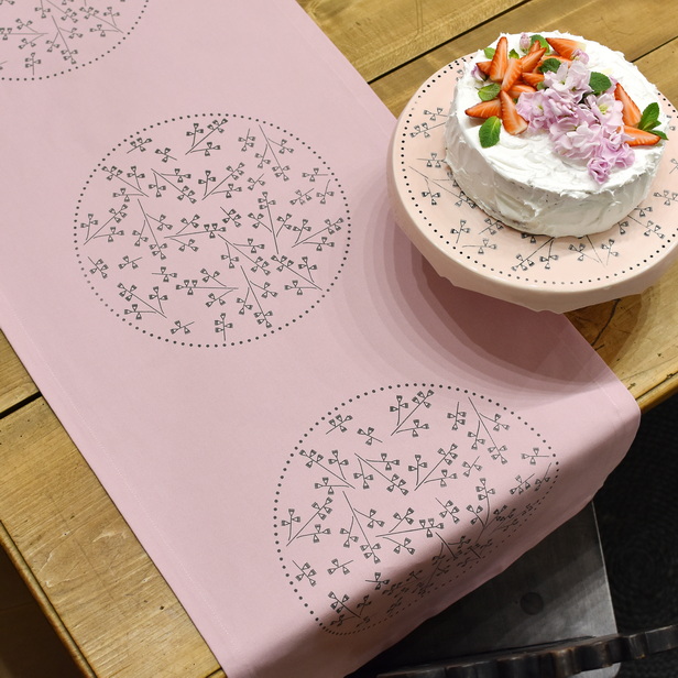 Tekač v roza barvi potiskan s sivo barvo vezenine.