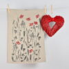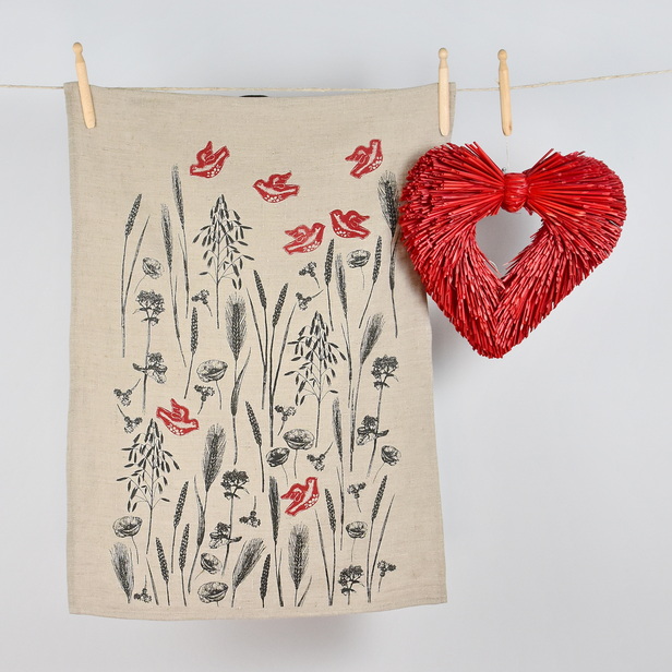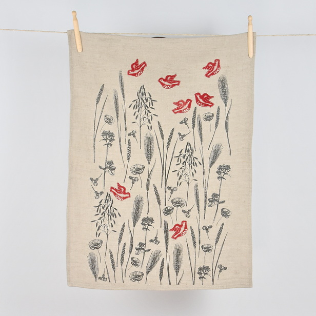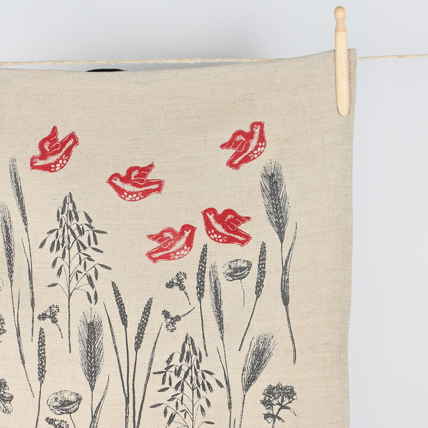Lanena brisača, ročno potiskana z vzorcem slovenskih žit, prinaša v kuhinjo pridih domačnosti in poklon slovenskim poljem.