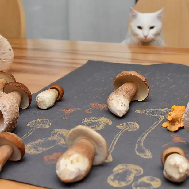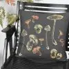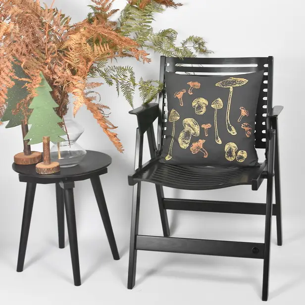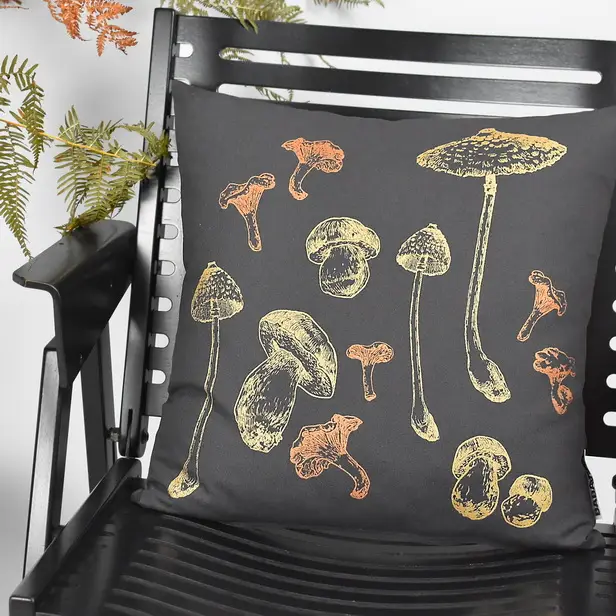 PREVLEKA ZA OKRASNO BLAZINO V TEMNO SIVI BARVI. 100% BIO BOMBAŽ. ROČNO POTISKANE ZLATE GOBE.