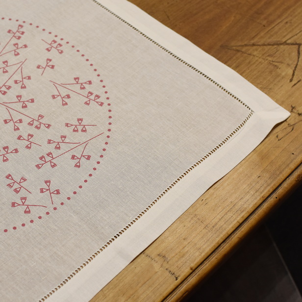 Lanen prtiček z robom, ki je še dodatno okrašen z rešelje tehniko. Ročno potiskan vzorec VEZENINA v roza barvi.