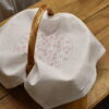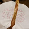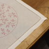 Lanen prtič z robom, ki je še dodatno okrašen z rešelje tehniko. Ročno potiskan vzorec VEZENINA v roza barvi.