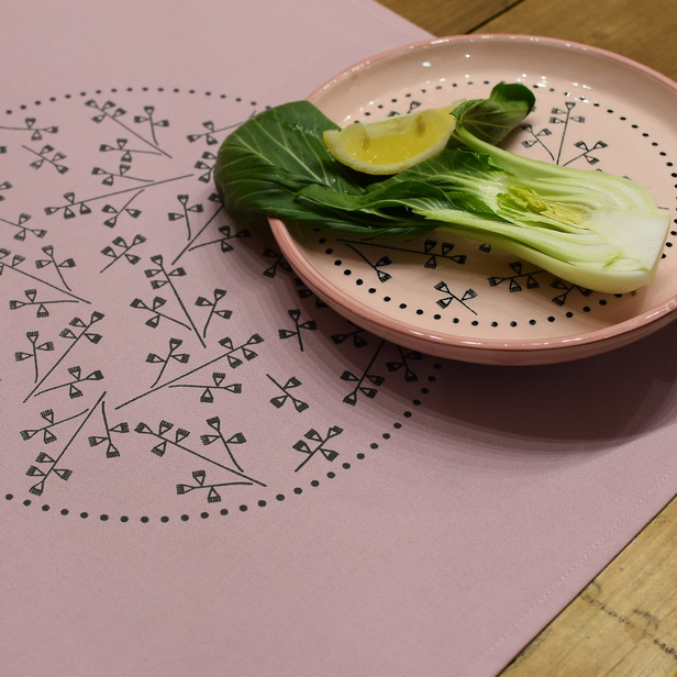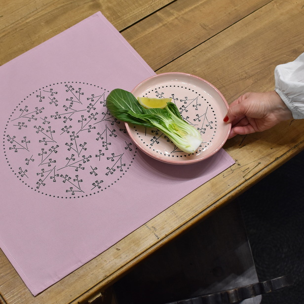 Roza prtiček, ročno potiskan z motivom garteljc v sivi barvi.