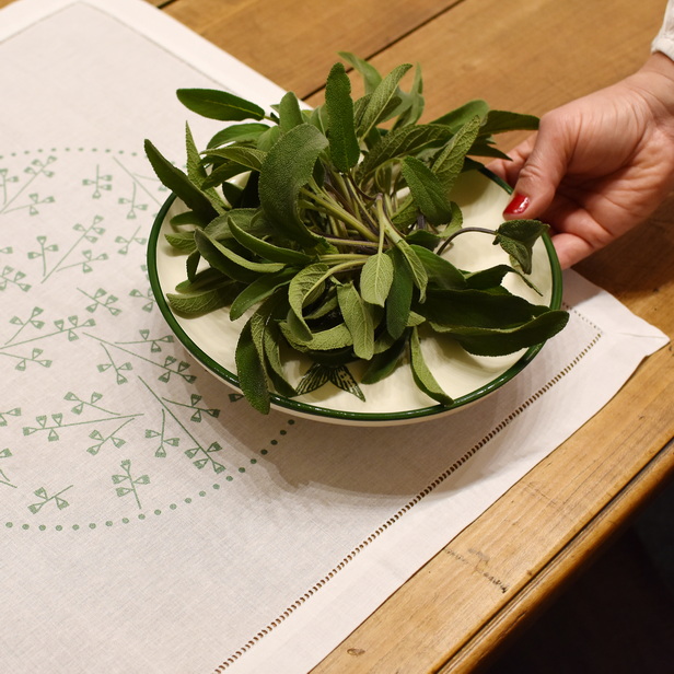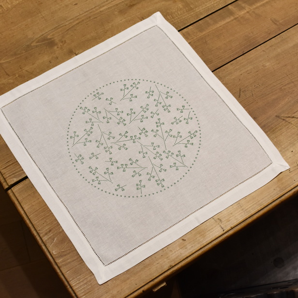Lanen prtiček z robom, ki je še dodatno okrašen z rešelje tehniko. Ročno potiskan vzorec VEZENINA v zeleni barvi.