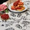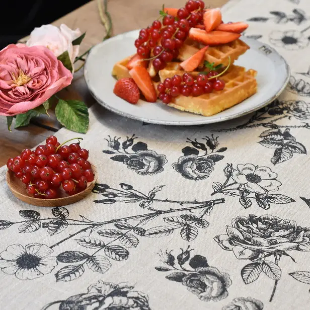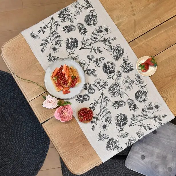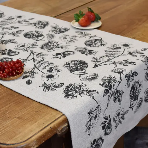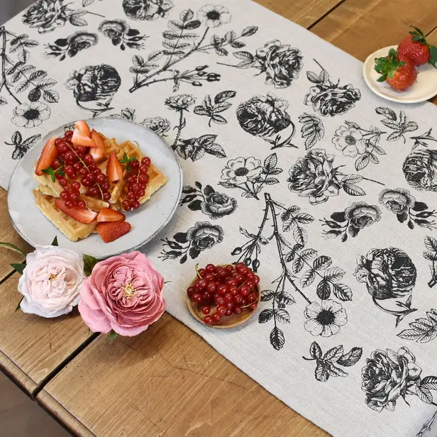 NAMIZNI TEKAČ IZ LANU. ROČNO POTISKAN Z IZBRANIM VZORCEM VRTNIC V ČRNI BARVI.