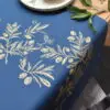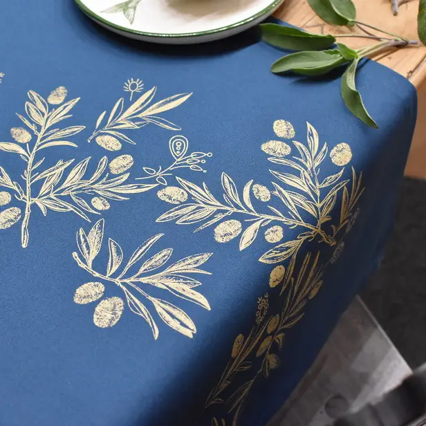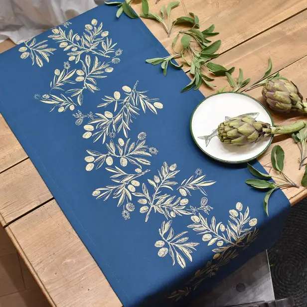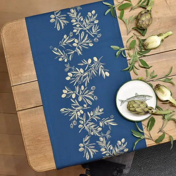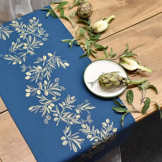 Namizni tekač v petrolej modri barvi z zlatim potiskom oljčne vejice, kjer so oljke upodobljene kot prstni odtisi — simbol človeka, ki skrbi za dragocena drevesa in iz oliv pridobiva oljčno olje.