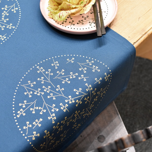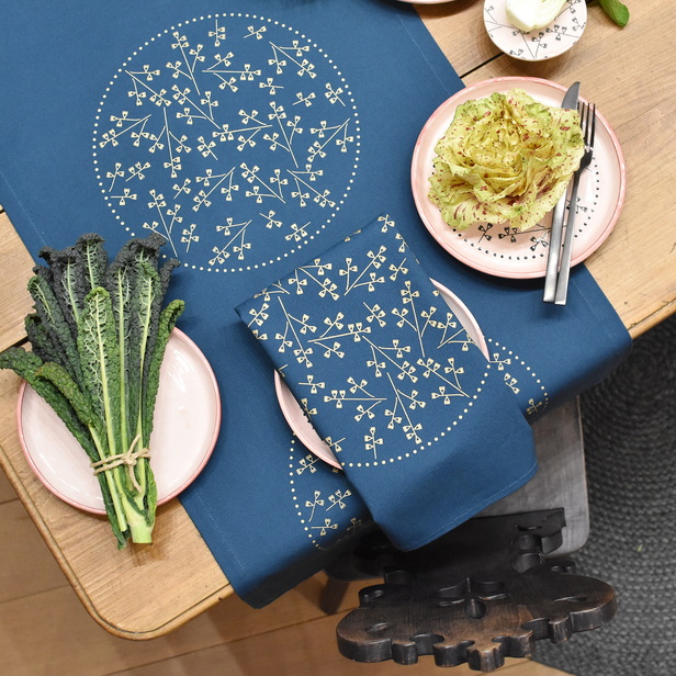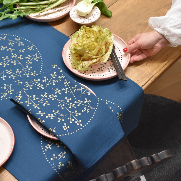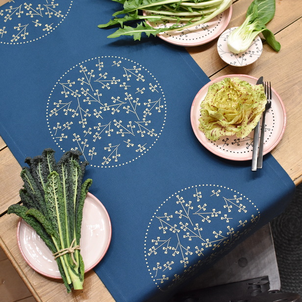 Namizni tekač v petrolej modri barvi, potiskan z zlato barvo vezenine.